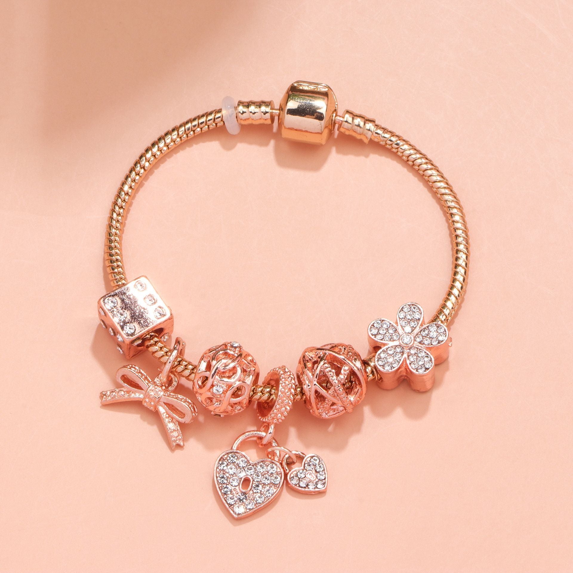 Hollow Out Crystal Flower Heart Bow Charm Bracelet(rose gold,19cm)