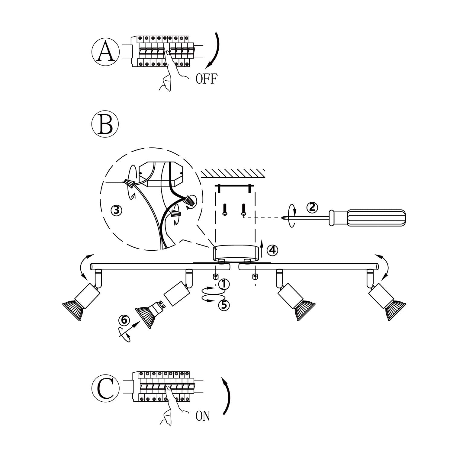 - ➤Rotatable Spot Lights:This Led Ceiling Light has 4 GU10 rotating lamp holders, which can rotate 90 degrees. The 3 rotating brackets configured for Spot Lights For Ceiling can be rotated 360 degrees. Led Spot Lights provide enough brightness and ultra wide lighting angle to meet your different needs.