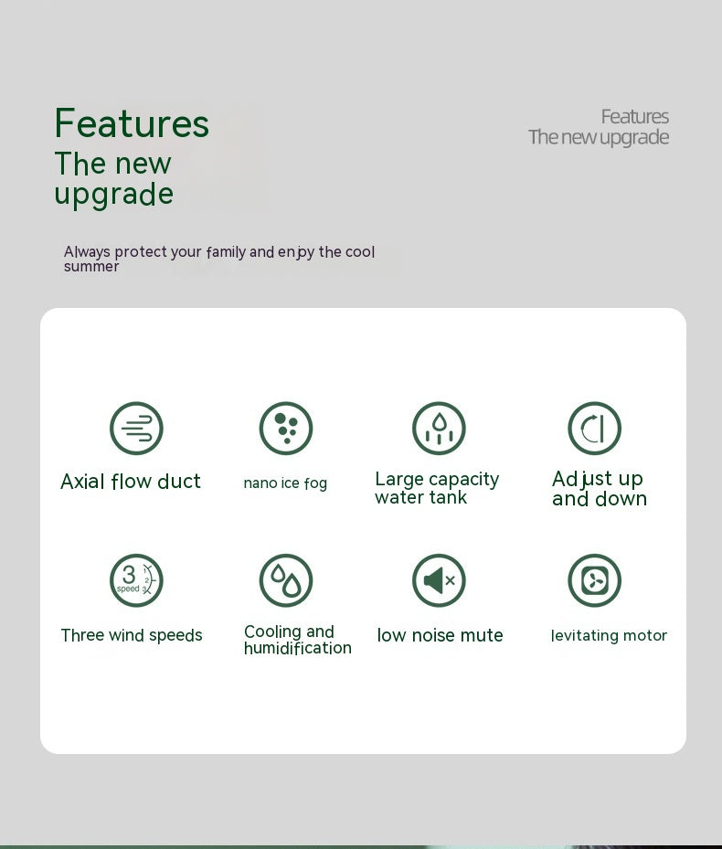 - Cooling Mist Technology: Utilizes advanced atomization to disperse fine water droplets, enhancing air humidity and moisturizing your skin.