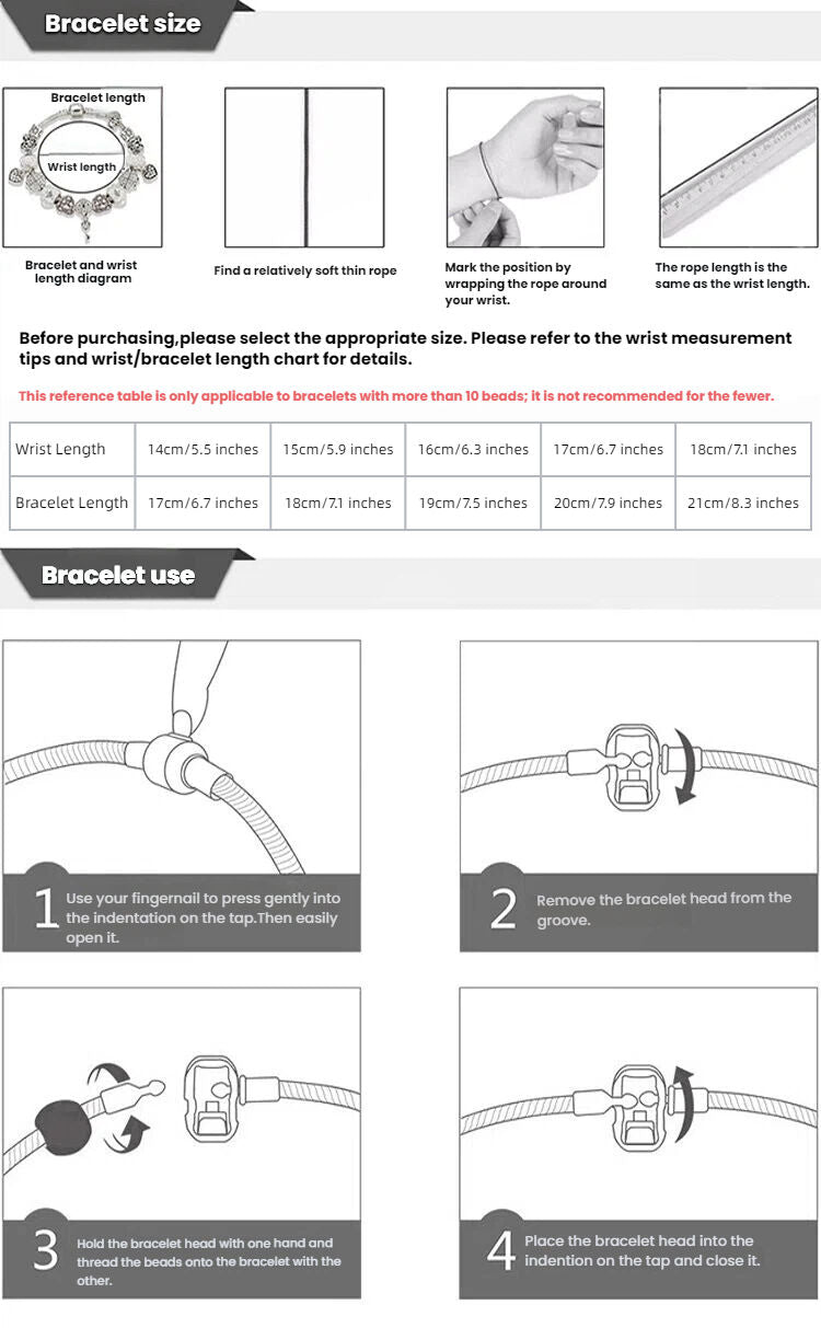 1. 10 Ready-Made Styles: Featuring elements like nature, animals, cartoons, sci-fi, and daily items, no customization needed. 2. Quality Materials Craftsmanship: Constructed from alloy, glass, rhinestones, zircon, with electroplating and oil dripping for long-lasting quality. 3. Varied Bead Shapes Combinations: Includes round, heart-shaped beads, solid/hollow designs, and pendants for an attractive appearance. 4. Unisex Versatile: Suitable for both men and women, ideal for daily use, parties, or as gifts. 5. Multiple Length Choices: Available in 16cm, 17cm, 18cm, 19cm, 20cm, 21cm to fit different wrist sizes. |