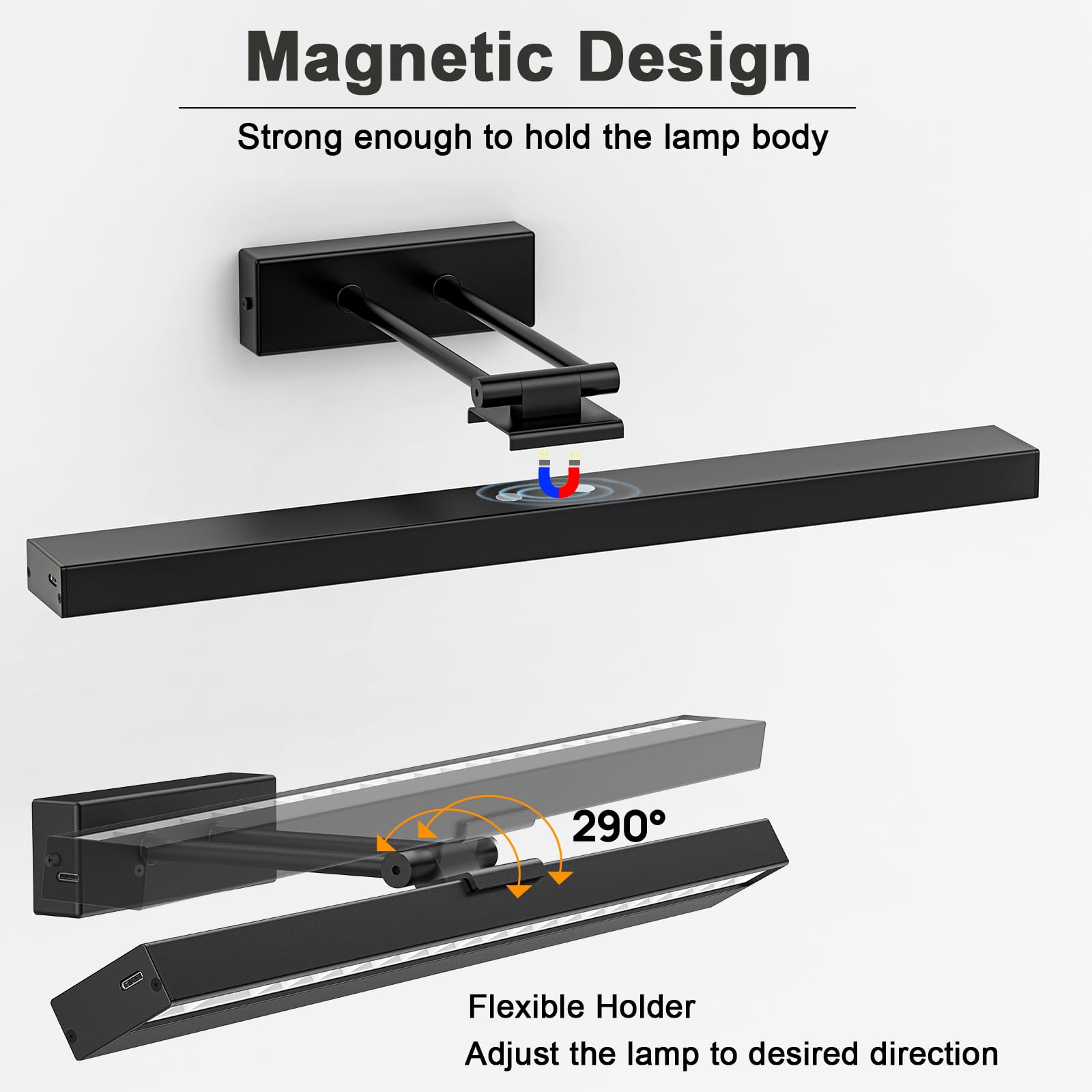 - Easy to Use:The battery-operated picture light bracket can be easily installed with the included screws, and the light bar is fixed by magnets. You only need to remove the light bar when charging. The card slot secures the light bar, preventing it from shaking and falling randomly.