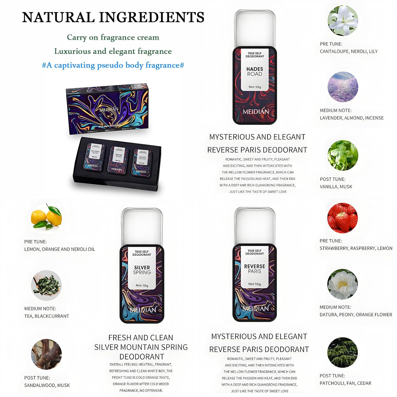 - 3 Unique Fragrances:Reverse Paris (fruity-floral), Silver Spring (cold orange-woody), Hades Road (lavender-vanilla) for diverse scent preferences.