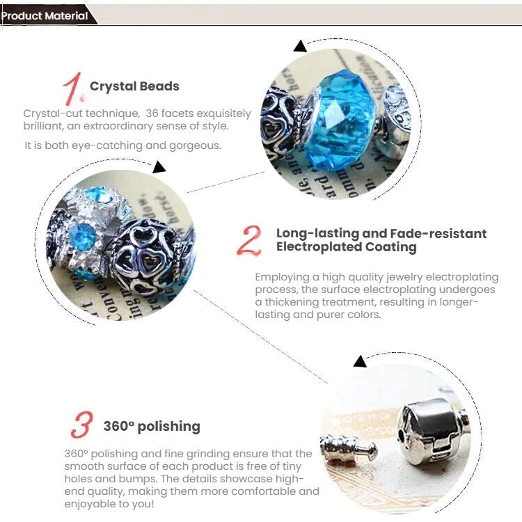 1. Avoid Chemicals: Keep away from perfumes, lotions, and other chemicals to prevent damage to the electroplated finish. 2. Remove When Bathing/Swimming: Take off the bracelet before bathing or swimming to avoid corrosion from water and soap. 3. Store Properly: Store in a dry, cool place, preferably in a jewelry box, to prevent scratching and tarnishing. 4. Handle with Care: Avoid pulling or tugging the chain forcefully to prevent breakage. 5. Clean Gently: Use a soft cloth to wipe clean; do not use abrasive materials that might scratch the surface. |