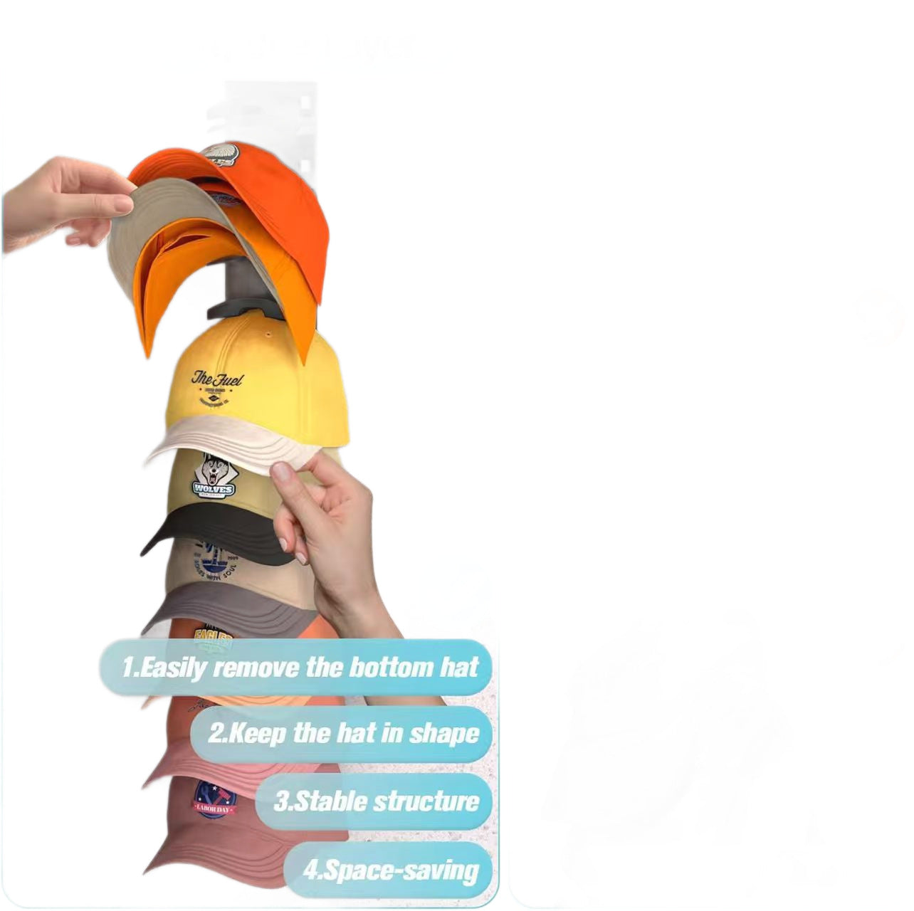 - Easy Bottom-Hat Removal: Smart design allows you to easily remove any hat from the bottom without disturbing the others.